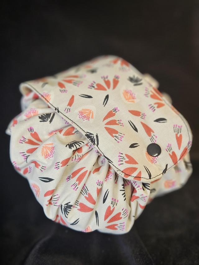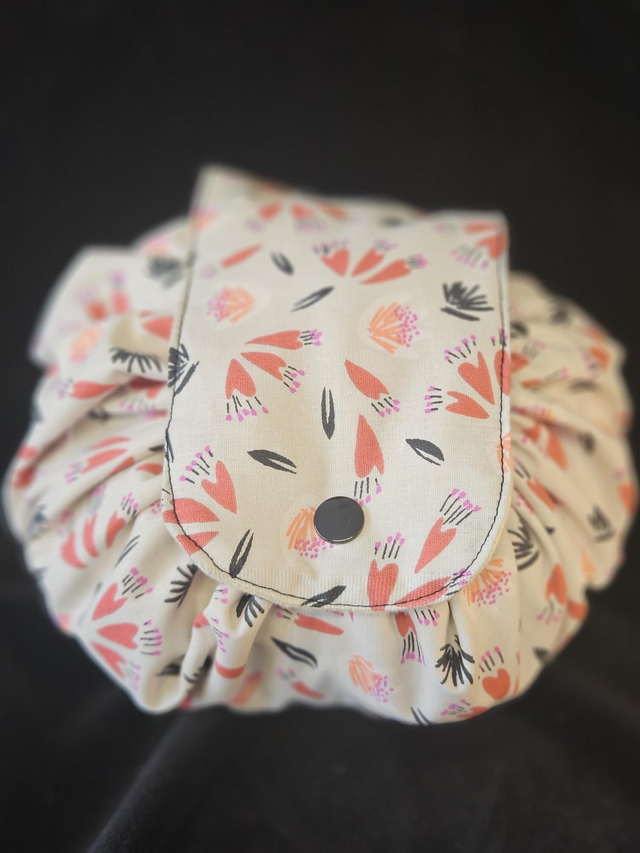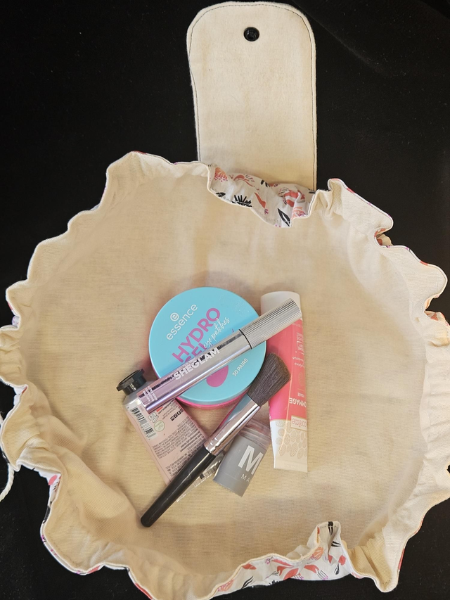 La bourse à maquillage s'ouvre complètement en grand pour avoir accès a son contenant et se referme en tirant sur les liens.