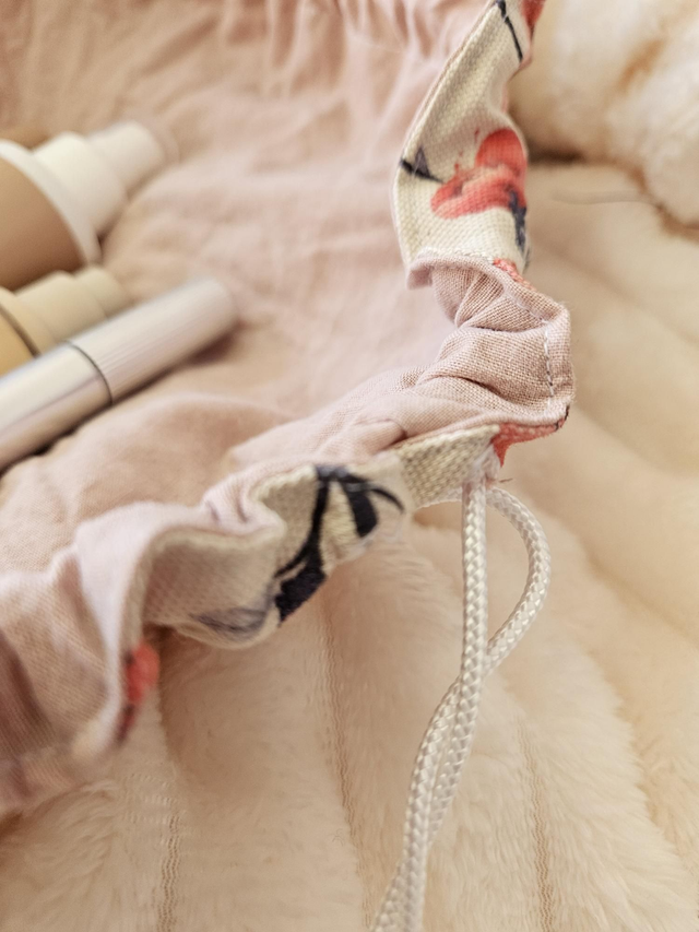 La bourse à maquillage s'ouvre complètement en grand pour avoir accès a son contenant et se referme en tirant sur les liens.
